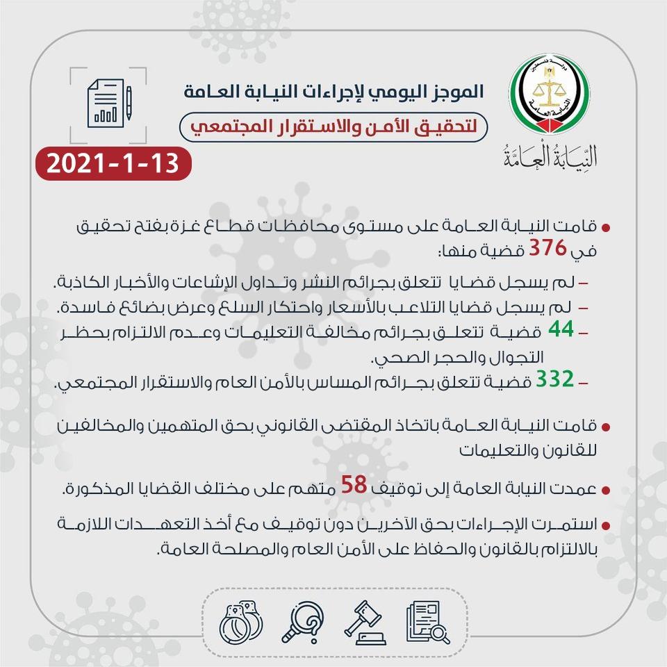 الموجز اليومي لإجراءات النيابة العامة لتحقيق الأمن والاستقرار13/1/2021